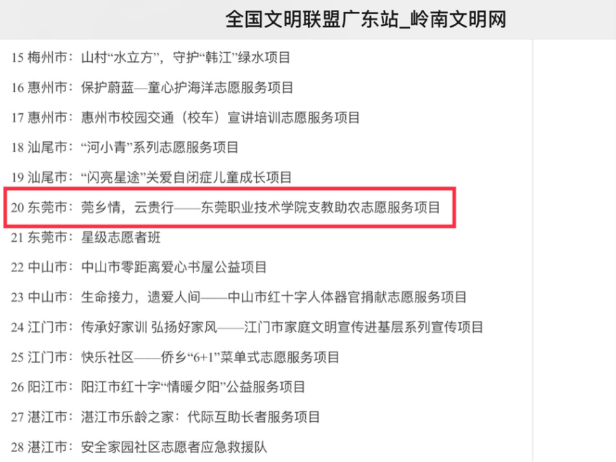该获奖志愿服务项目自2018年起,连续4年组建师生团队前往东莞市对口扶贫地开展支教助农社会实践,结合疫情防控新形态探索公益直播、产业助农等多种模式,助力乡村振兴。曾多年获广东省大中专学生志愿者暑期“三下乡”社会实践活动多项荣誉称号,在2021年“益苗计划”——广东志愿服务组织成长扶持行动暨志愿服务项目大赛中获“省级示范项目”,多次被“广东学联”、“广东志愿者”、“南方+”、“志愿东莞”等媒体报道。