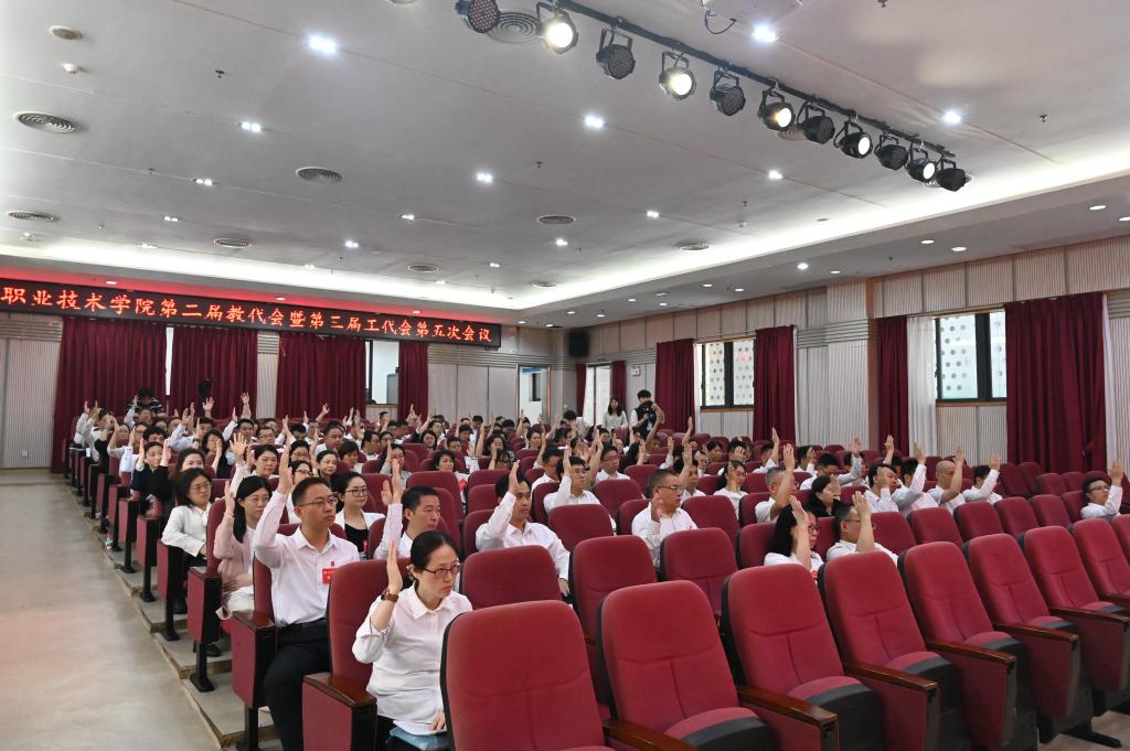 闭幕式上,党委委员、副校长杨云奇宣读大会决议(草案),会议一致表决通过了大会决议。会议认为,贺定修校长所作的工作报告,实事求是地总结了学校过去一年取得的发展成绩,内容全面,亮点喜人。报告提出将2025年确立为学校“建双高、办本科”新征程上的“综合改革年”,紧紧瞄定“建双高、办本科”进一步深化学校综合改革,重点做好“实施新时代立德树人工程”“坚持产教融合打造‘莞邑工匠’培养高地”等八项重点任务,目标明确、重点突出,符合上级精神和学校实际,为学校进一步提升办学质量和水平指明了方向。
