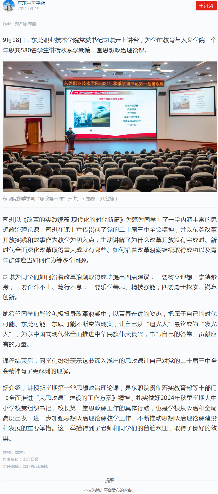 【学习强国】东职院秋季学期“思政第一课”开讲
